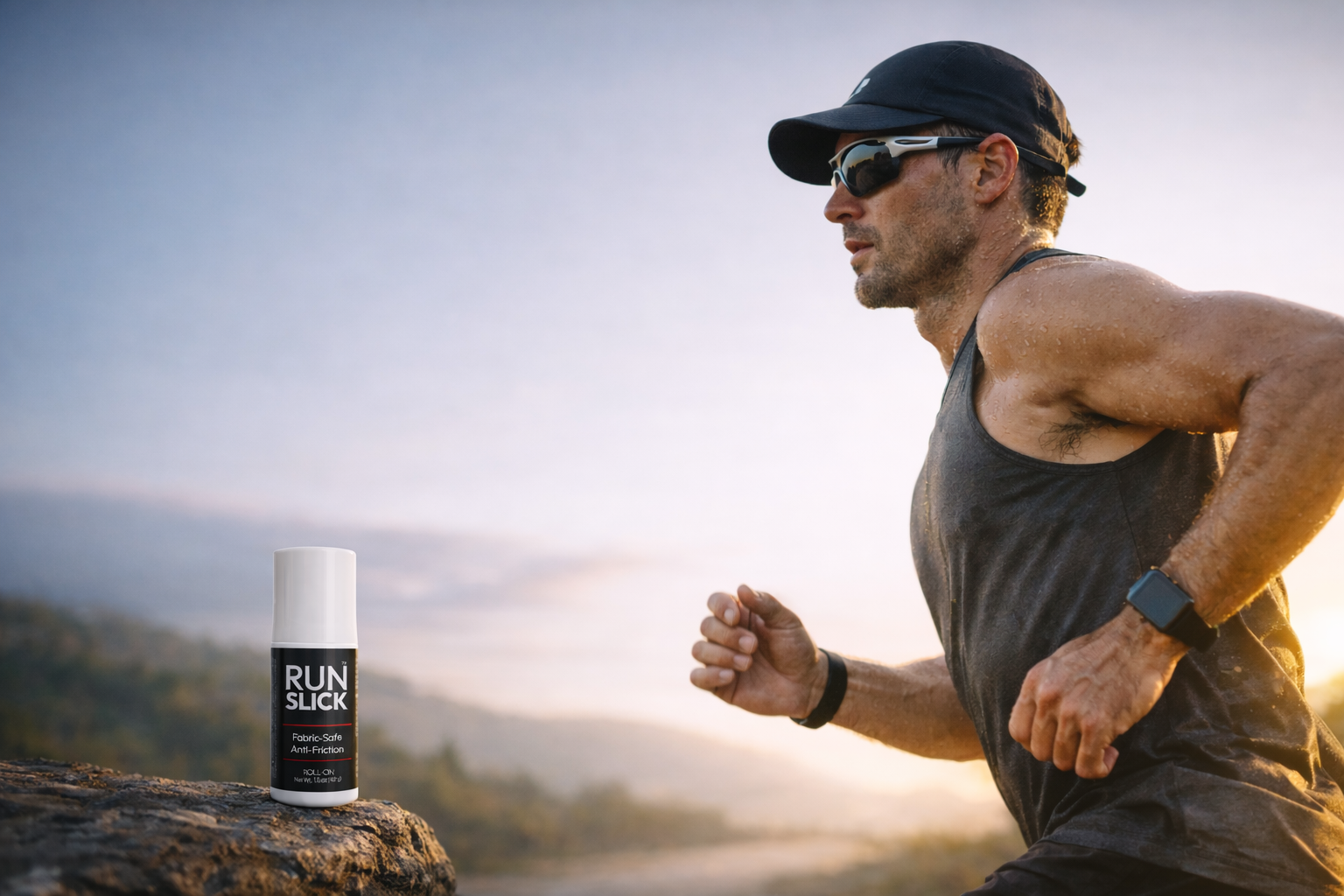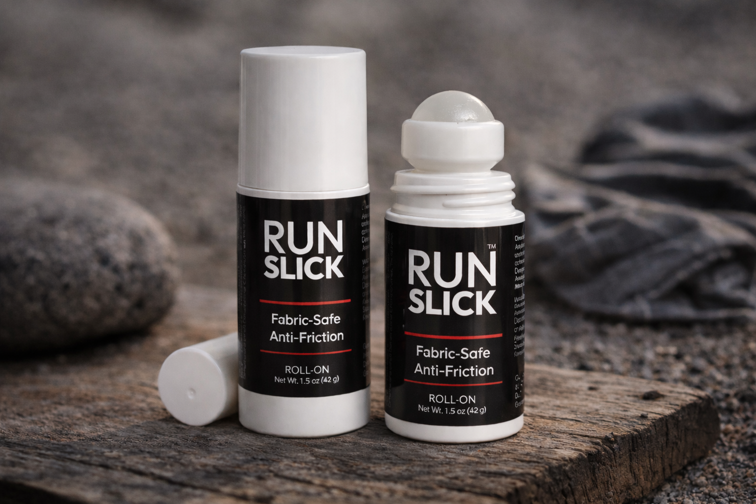 Run Slick is a fabric-safe performance roll-on designed to help reduce friction during running and repeated movement. It goes on clear, dries quickly, and feels lightweight on skin.